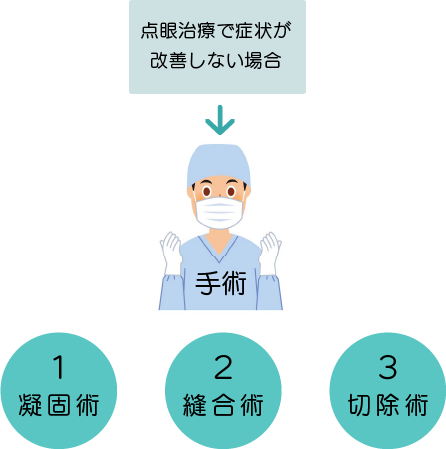 結膜弛緩症の手術方法3つ 点眼治療にて症状が改善しない場合、弛緩した結膜の余剰分を減らす手術しか有効な治療法がありません。手術には余剰分の結膜を、(1)凝固、(2)縫合、または(3)切除する方法があります。
